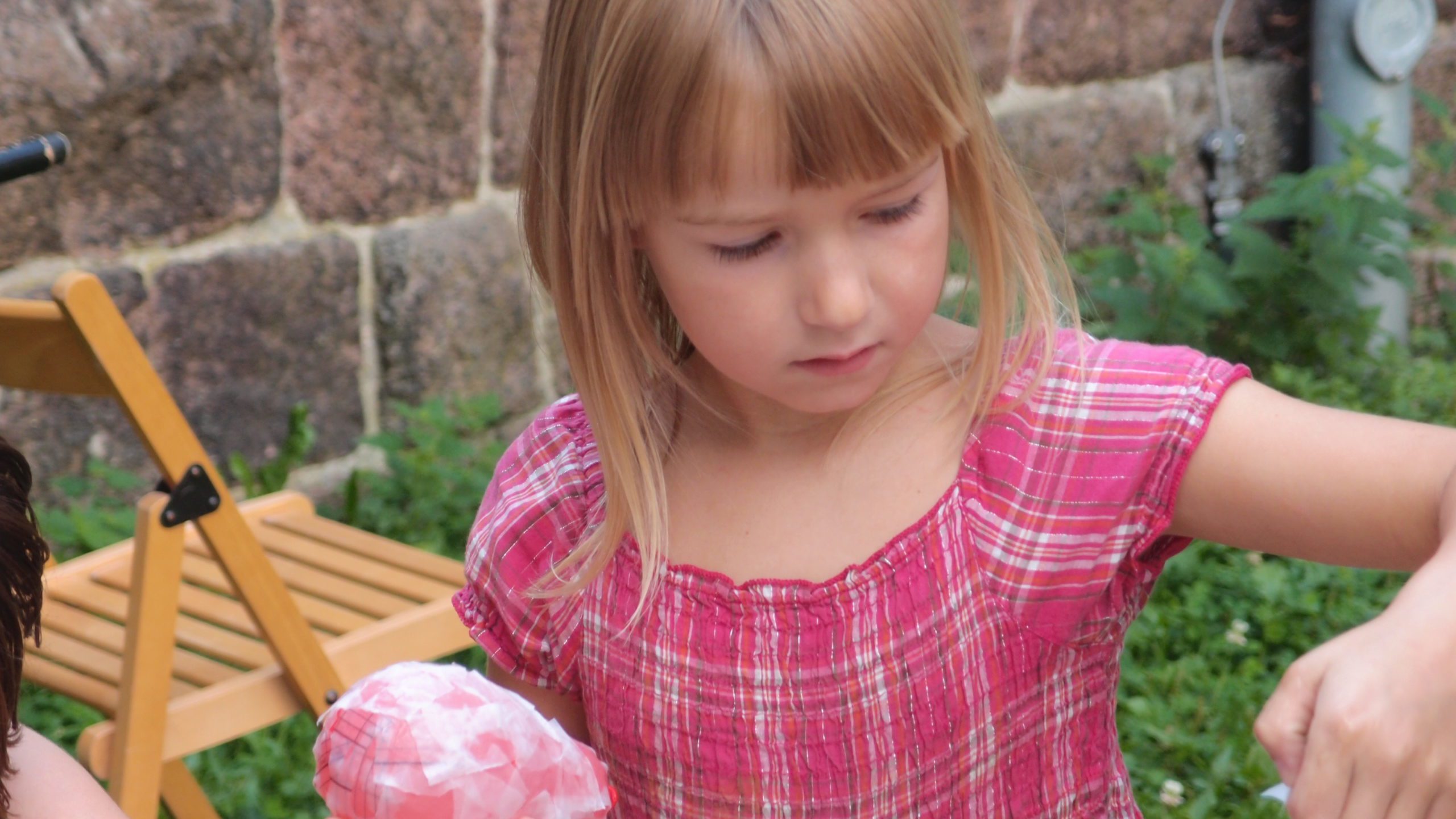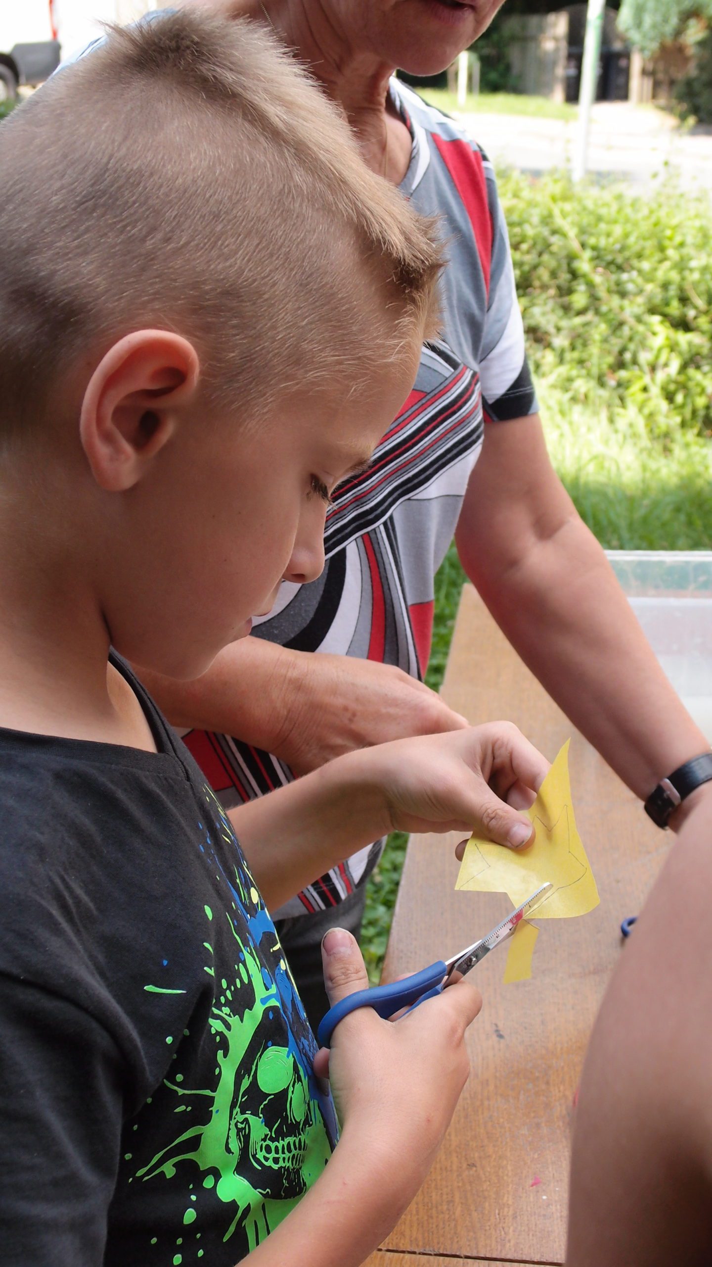 Kinder und Erzieherin bastelten Lampenschirmchen für eine Lichterkette.